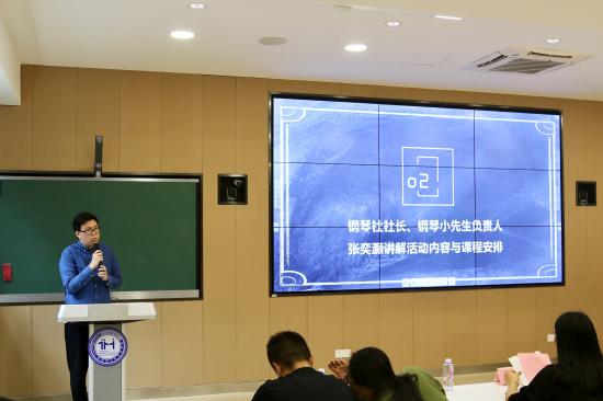 第二项议程由钢琴社社长兼钢琴小先生负责人张奕灏同学讲解活动内容和课程安排。张奕灏同学从教学目标、内容、难点、重点以及规章制度出发,统一制定了教案,明确了本次三个课时的课程内容:第一课时,音节与练习曲弹奏;第二课时,乐曲弹奏;第三课时,音阶、练习曲、乐曲模拟测验考试。通过大班化的课程教学,结合空余时间的一对一辅导,可以取得良好的教学效果。