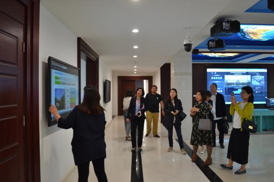 交流团一行在管理学院院长程葆青的陪同下参观了智慧旅游体验中心,并在管理学院顾晓欢老师的演示下体验并了解了购票系统模拟,实时景点观测,实时客流统计,大数据分析等设施与软件的运用。