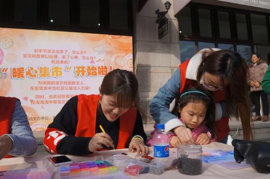 本次爱心集市共开设了10个摊位,有来自汇旺社区的居民组成亲子摊位,也有来自爱心人士捐助的公共摊位,还有来自艺术教育专业第一支部同学们自设的拼豆豆和才艺表演摊位。每个摊位售卖各种闲置物品,比如图画书、毛线帽、手工作品、玩具等等。此外,每个摊位还设有志愿者分别负责爱心义卖销售和收银。在同学们大声卖力的吆喝中,前来参与义卖的群众越来越多,同学们贴心的服务让暖心集市充满了朝气。