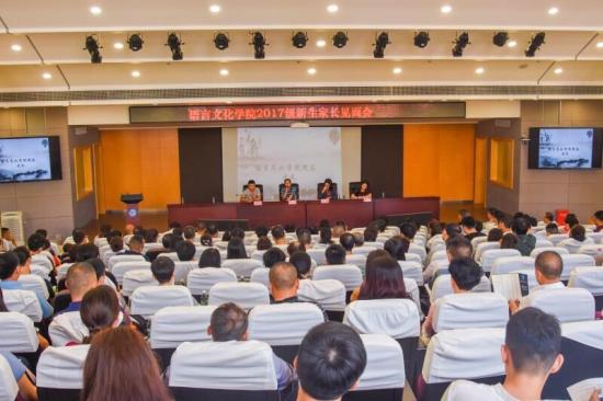 2017年9月17日中午,语言文化学院在晖华楼报告厅召开了2017级新生家长会。学院院长史文,党总支书记孙超,副书记杨央、刘庆奇,德语专业支部书记曹占侠,日语专业支部书记李江涛,新生辅导员张旭、顾加慧以及来自全国各地的250余名新生家长参加了会议。会议由孙超主持。
