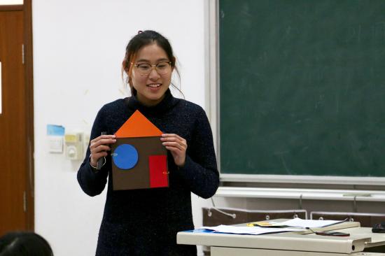 15小学教育1班的余逸舟同学以独特的英语教学法启发同学们积极探索生活中图形的奥秘,她富有感染力的教学方式给学生创造了一个轻松快乐的课堂环境,令人耳目一新。