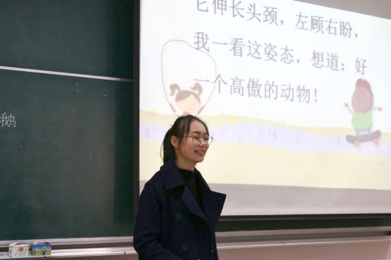 15小学教育2班的李沪娟同学使用新颖的智力闯关形式、富有童趣的嗓音,带领同学们走进《动物王国》,使同学们了解各种小动物的特征,体会课本中动物世界独有的趣味。