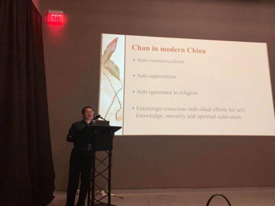 傍晚,史文老师在大学的会议中心做了一场题为“禅宗对中国哲学的影响”的学术报告,到场师生近30余人,包括主管学术的副校长,艺术学院的院长、专业主任等7名教授。在一小时的讲座中,史文老师以清晰的思路和流利准确的英文,从思想史的角度,为听众介绍了中国禅宗的核心思想,及其与传统儒学的激荡、交融,以及如何促进了宋明新儒学的诞生和发展。讲好“中国故事”的同时,也讲了“天华故事”,介绍了天华学院的“经典阅读”项目,以及“四书,六祖坛经”等经典的当代普及情况。特别有意思的是,许多听众对于“六祖慧能”的故事很感兴趣。讲座过后,几位教授饶有兴趣地问了许多问题,并表示很感谢为他们做了中国文化的启蒙。