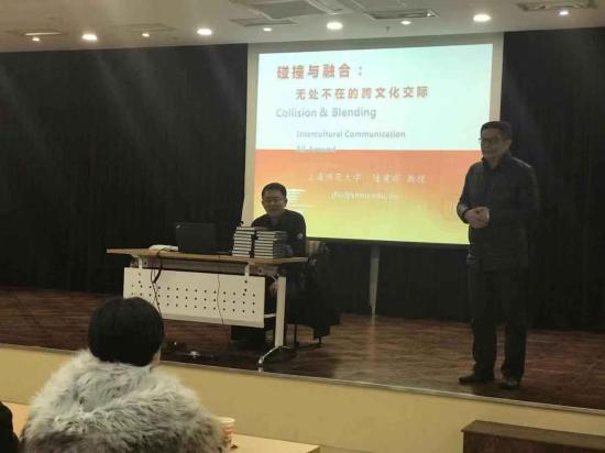 陆建非教授用了几则笑话幽默开场,吸引了在场的每一位听众,并引导大家思考,跨文化交际是不可避免,是无处不在,是无时不在的,深刻影响着每一个人:你来我往、我来你往,你中有我,我中有你;交际、交往、交流,并不时地交锋,通过碰撞,达到融合。