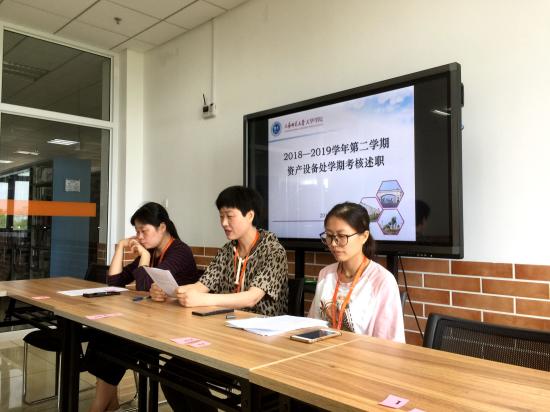 2019年6月17日和6月18日,资产设备处组织开展学期考核述职,资产设备处处长朱清,副处长董海霞、周建文及资产设备处副处级干部全程参与并组织了考核。考核按照原资产设备处、图书馆、车队三个条块分别组织实施。