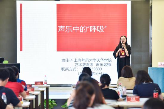 如今,众多教育工作者不可避免地承受着声带职业病带来的影响,其根本原因是发声方式不正确,对声带缺乏保护意识。贾老师通过工作坊活动,示范讲解了正确的呼吸方式和发声方式。贾老师带领学员们一同开嗓,体验正确的发声歌唱,用两首练声曲逐步深入讲解从气息到咬字,再到笑肌的使用;接着用一首经典红歌《绒花》,让学员们更直观地感受了声乐中的“呼吸”,练习了气息发声的技巧。