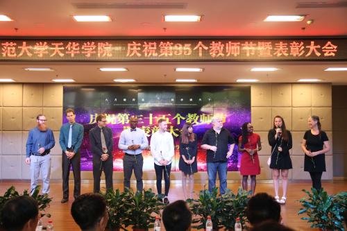 随着我校国际化教育的快速发展,我校中外合作办学项目和专业已达13个,涵盖3个国家8所院校,每年有近60位客座教授来我校授课,他们被称之为“飞行教授”。此外,今年,我校还特别聘请了13位常驻外教,数量上创历史新高。在精彩的文艺表演过后,常驻外教上台亮相,依次作自我介绍,并用中文祝在座所有老师节日快乐。