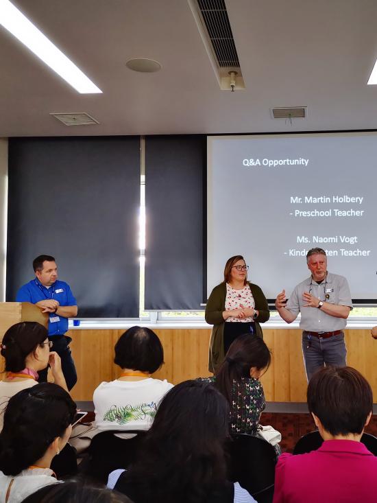 随后,两位协和国际幼儿园的资深教师分别介绍了大中小班的一日流程、师资发展等。协和国际幼儿园基于研究的教学理念和实际操作,鼓励不断反思和终身学习的教师,关注孩子的全面发展。不断提及的主题词,例如年龄适宜、自主游戏、家园共育、主题课程、整合教育等方面,引起园长们的共鸣。园长们就课程、教学、入学等问题积极提问。
