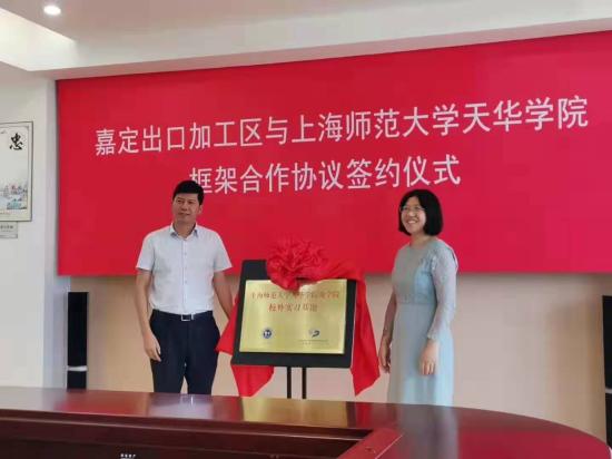 然后,商学院院长程葆青与嘉定出口加工区副总经理徐瑞祥共同为“上海师范大学天华学院商学院校外实习基地”揭牌。