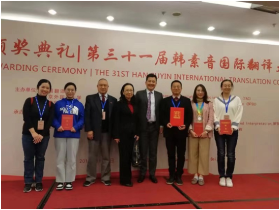 2019年11月9日,第三十一届“韩素音国际翻译大赛”颁奖典礼暨2019中国翻译协会年会于北京世纪金源大酒店隆重举行。本届大赛中我校荣获“最佳组织奖”,初等教育学院三双教师冯恬恬获汉译英二等奖,初等教育学院三双教师隗钟乐、16级小学教育专业学生孔雪儿、王静然获英译汉优秀奖。初等教育学院史文院长、胡雅楠副院长、万正方教授、冯恬恬老师以及16级小学教育专业学生孔雪儿、王静然六位师生赴京参加颁奖典礼。