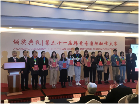 韩素音国际翻译大赛始于1989年,由英籍著名女作家韩素音女士提供赞助基金。本竞赛以其优秀的选材、严格的匿名评审制度、对评审结果的详细解读,受到全国乃至海外青年翻译爱好者的欢迎和认可,是我国翻译界的最高奖项,被称作翻译界的“奥斯卡”。本届大赛有英汉、法汉、俄汉、西汉、阿汉五种语对的互译,参赛人数一万多名,共收到有效参赛译文11900余份。参赛人数为历届之最,实现历史突破。经过四轮的严格评审和终审讨论,共评出获奖者346名。