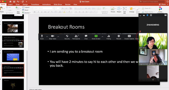 本次ZOOM平台直播测试持续1个小时,共96人参与,直播效果良好。除2017级学前教育(中外合作办学)专业同学、外方教师、合作授课中方教师外,学前教育学院教学院长、专业主任、辅导员,国际交流处、网络中心负责老师,以及全校各相关专业的中方合作教师等十余人共同参与了观摩和讨论。测试帮助学生与教师熟悉和现场操作了ZOOM平台的各项基本功能,进一步了解课堂互动的基本规则和教师之间、师生之间的互动模式,掌握网络运行情况及可能出现的困难或障碍等。通过进一步培训和使用,各职能部门将竭尽全力,最大程度整合资源、发挥主观能动性,保障平台在此次远程教学中的稳定性,优化师生们的教学和学习体验,确保教学质量和效果。