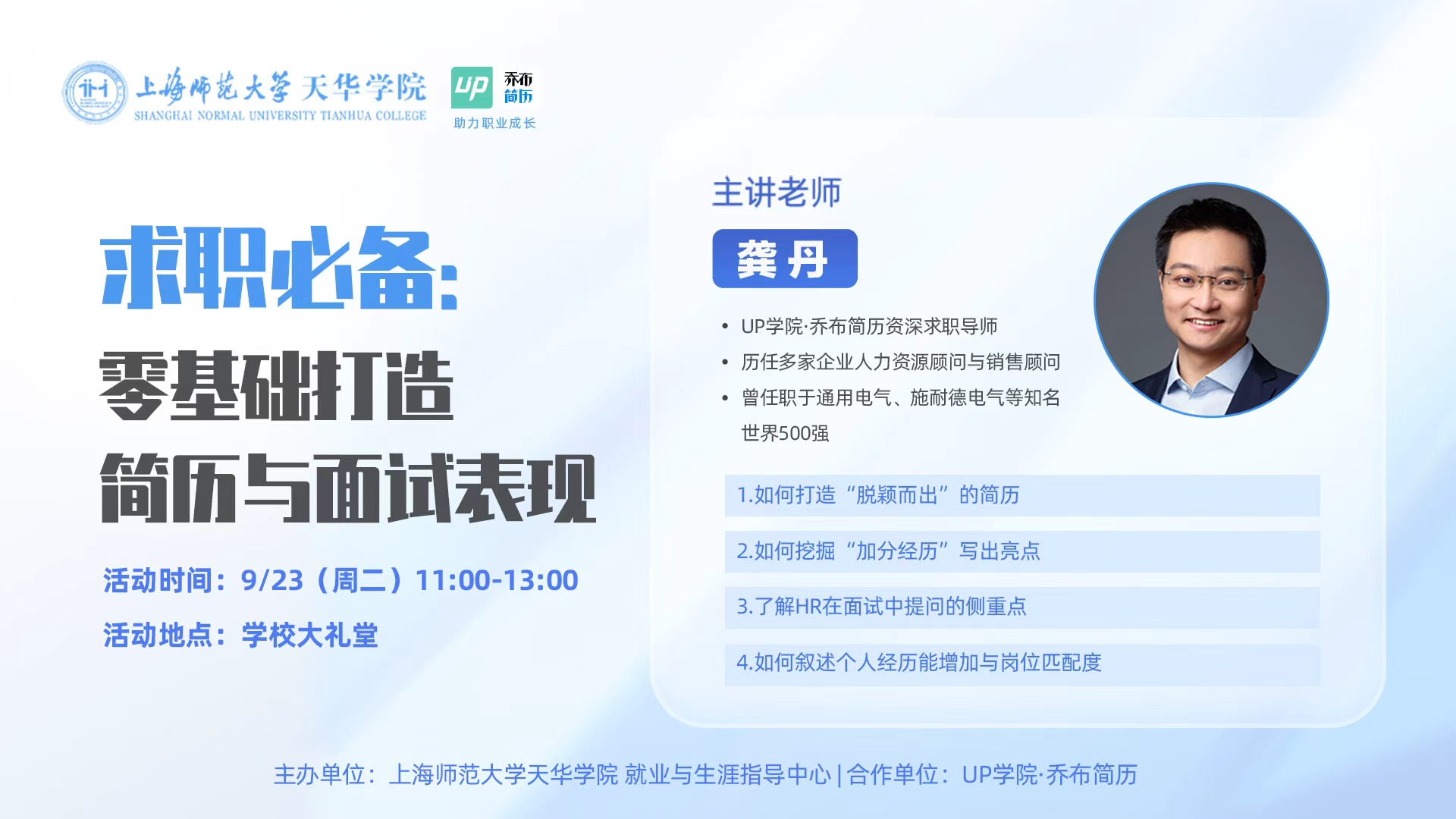 求职必备:零基础打造简历与面试表现题目:《求职必备:零基础打造简历与面试表现》内容:1、聚焦学生求职过程中的核心技能,系统讲解:2、简历的核心要素、排版技巧与内容优化策略;3、面试前的准备事项、常见问题应答方法及面试实用礼仪。时间:2025年9月23日(星期二)中午 11:00地点:晖华楼大礼堂2025-09-19