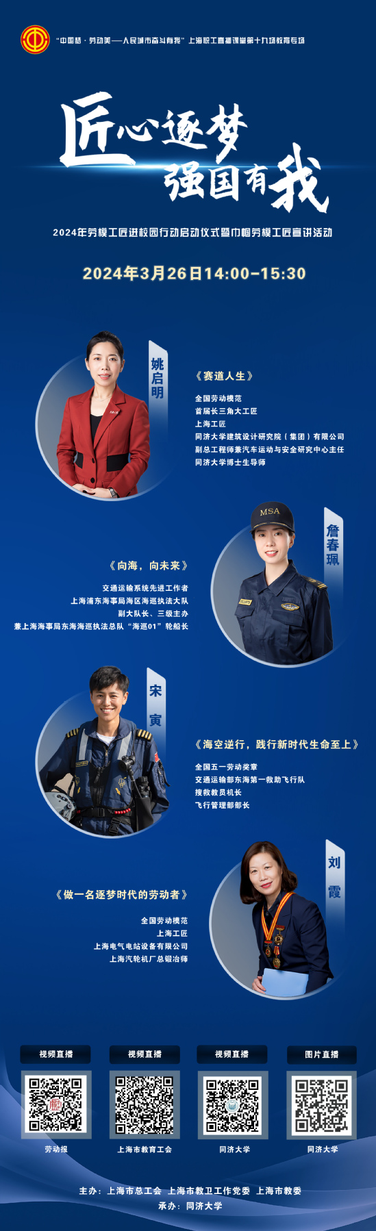 2024年劳模工匠进校园行动启动仪式暨匠心逐梦 强国有我巾帼劳模工匠宣讲活动由市总工会、市教卫工作党委、市教委主办、同济大学承办的2024年劳模工匠进校园行动启动仪式暨匠心逐梦 强国有我巾帼劳模工匠宣讲活动将于今天3月26日下午2点进行。届时“中国赛道设计第一人”姚启明、“海上花木兰”詹春珮、“中国第一代女搜救机长”宋寅、“中国第一女焊工”刘霞等劳模工匠将作分享交流。敬请关注、转发、扫码收看。2024-03-26 -