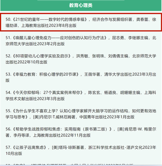 中国教育新闻网 | 龚春蕾译著《21世纪的童年》获评中国教育新闻网2023年度“影响教师的100本书”“教育心理类”TOP12023-12-27