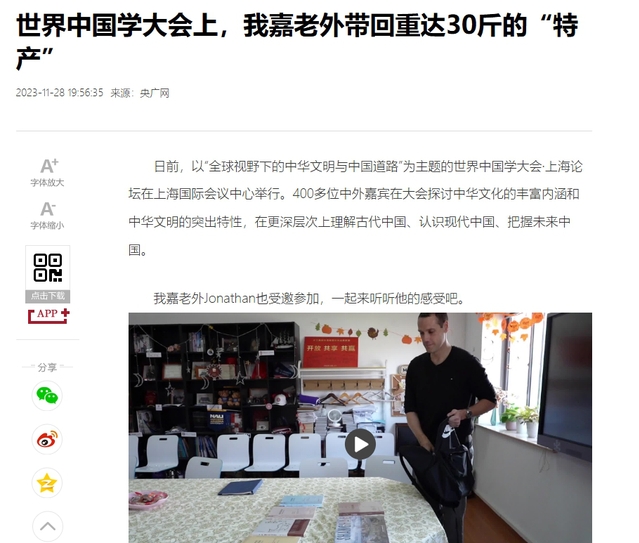 央广网 | 世界中国学大会上,我嘉老外带回重达30斤的“特产”来源:央广网 2023年11月28日标题:世界中国学大会上,我嘉老外带回重达30斤的“特产”作者:彭晓妍日前,以“全球视野下的中华文明与中国道路”为主题的世界中国学大会·上海论坛在上海国际会议中心举行。400多位中外嘉宾在大会探讨中华文化的丰富内涵和中华文明的突出特性,在更深层次上理解古代中国、认识现代中国、把握未来中国。“大会气氛很open,会议记录有收获”Jonathan是来自上海师范大学天华学院的一名加拿大籍外教,主要负责教授学术英语和英美文学导论等课程。此次受邀参加2023世界中国学大会,Johnathan感到十分开心:“整个大会的气氛,一如上海这座城市带给我的感受一样,海纳百川。”“150多个国家、30多个国际组织签署共建‘一带一路’合作文件,中国如何把‘朋友圈’越做越大?中国式现代化的途径和模式是什么?”来自各国的专家学者,就“全球视野下的中华文明与中国道路”这一主题开展交流讨论,不论国家、语言,与会人员尽情抒发着自己对“中国式现代化”“中国文学”“中国历史”的观点,交流学术成果。论坛上,专家们带来自己的议题与观点。论坛下,Johnathan一边聆听,一边在大会目录上记下随2023-11-28 -