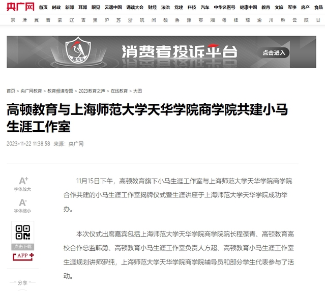 央广网 | 高顿教育与上海师范大学天华学院商学院共建小马生涯工作室标题:高顿教育与上海师范大学天华学院商学院共建小马生涯工作室11月15日下午,高顿教育旗下小马生涯工作室与上海师范大学天华学院商学院合作共建的小马生涯工作室揭牌仪式暨生涯讲座于上海师范大学天华学院成功举办。本次仪式出席嘉宾包括上海师范大学天华学院商学院院长程葆青、高顿教育高校合作总监韩勇、高顿教育小马生涯工作室负责人方超、高顿教育小马生涯工作室生涯规划讲师罗纯,上海师范大学天华学院商学院辅导员和部分学生代表参与了活动。党的十九届五中全会提出2035年建设教育强国的远景目标,明确“十四五”时期“建设高质量教育体系”的工作任务,为了更好地适应国内外经济发展需求,建设高质量大学生职业生涯发展教育体系,作为高校在大学生教育培训领域多年的合作伙伴,——高顿教育以旗下品牌「小马生涯工作室」为主体,推出共建方案。(机构供图,央广网发)会上,由上海师范大学天华学院商学院院长程葆青进行致辞。程院长就当前大学生面临的求职形势进行讲解,以自身事例启发并帮助现场的每一位同学深刻理解了提前制定职业规划的必要性。(机构供图,央广网发)随后,高顿教育小马生涯工作室负责人方超详细解读了双方未来合作的规划。方老师表示,2023-11-22
