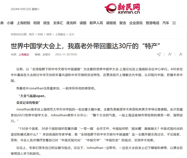 新民网 | 世界中国学大会上,我嘉老外带回重达30斤的“特产”来源:上观新闻 2023年11月28日标题:世界中国学大会上,我嘉老外带回重达30斤的“特产”作者:彭晓妍日前,以“全球视野下的中华文明与中国道路”为主题的世界中国学大会·上海论坛在上海国际会议中心举行。400多位中外嘉宾在大会探讨中华文化的丰富内涵和中华文明的突出特性,在更深层次上理解古代中国、认识现代中国、把握未来中国。我嘉老外Jonathan也受邀参加,一起来听听他的感受吧。“大会气氛很open,会议记录有收获”Jonathan是来自上海师范大学天华学院的一名加拿大籍外教,主要负责教授学术英语和英美文学导论等课程。此次受邀参加2023世界中国学大会,Johnathan感到十分开心:“整个大会的气氛,一如上海这座城市带给我的感受一样,海纳百川。”“150多个国家、30多个国际组织签署共建‘一带一路’合作文件,中国如何把‘朋友圈’越做越大?中国式现代化的途径和模式是什么?”来自各国的专家学者,就“全球视野下的中华文明与中国道路”这一主题开展交流讨论,不论国家、语言,与会人员尽情抒发着自己对“中国式现代化”“中国文学”“中国历史”的观点,交流学术成果。论坛上,专家们带来自己的议题与观点2023-11-28 -