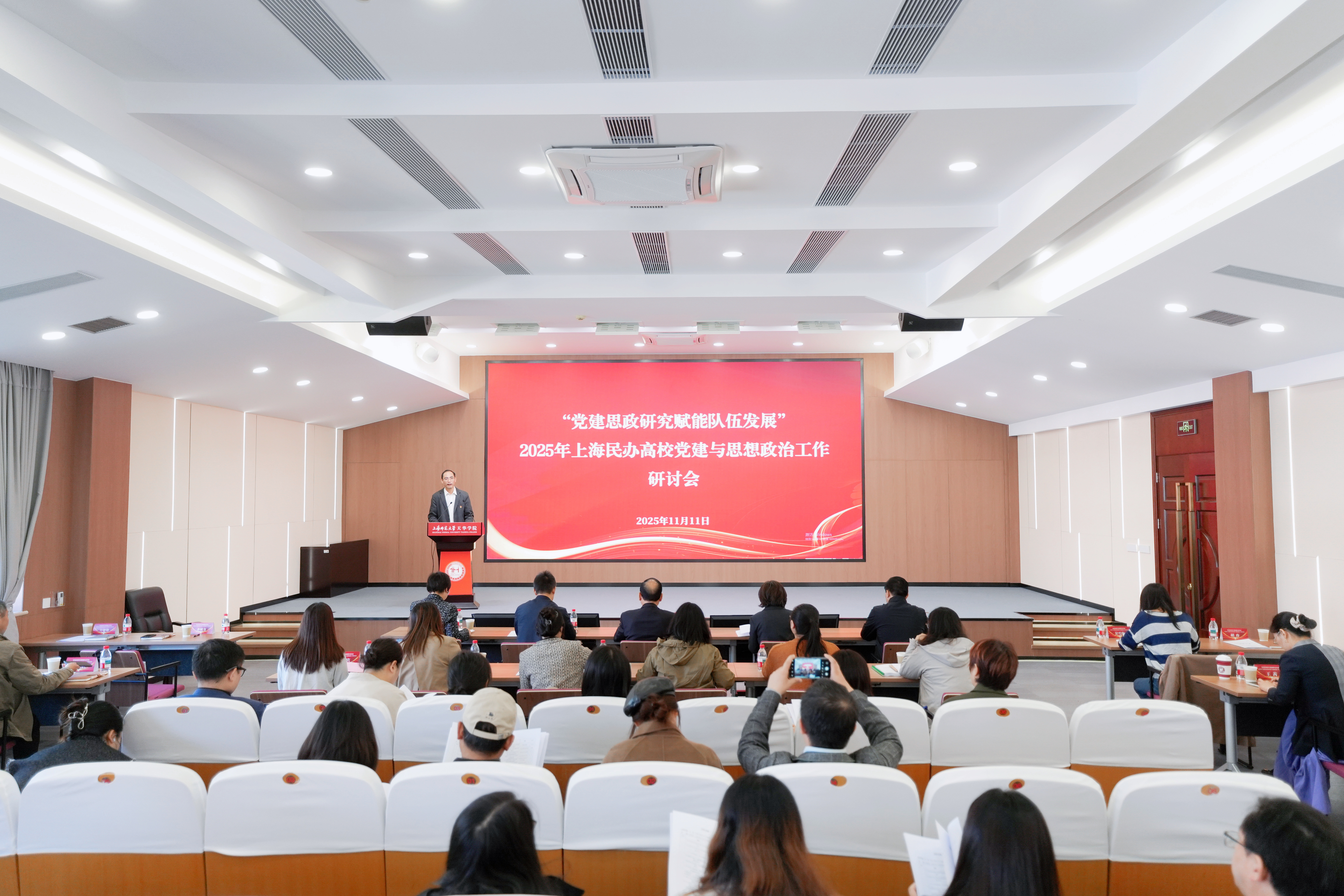 2025年上海民办高校党建与思想政治工作研讨会在天华学院举办11月11日上午,2025年上海民办高校党建与思想政治工作研讨会在上海师范大学天华学院举办。上海市民办教育综合党委一级主任科员周光狼,天华学院党委书记高建华、党委副书记许岳等领导,以及来自“学习强国”上海平台、同济大学、上海工程技术大学等多所高校的专家学者和各民办高校分管党建思政课题工作负责人、联络员、2025年研究中心课题负责人等70余人参加会议。会议由天华学院校级助理、党办主任、宣传部长齐砚奎主持。天华学院党委书记高建华代表研究中心和天华学院对与会人员表示热烈欢迎。高建华指出,此次的研讨主题聚焦于“党建思政研究赋能队伍发展”,深入探讨如何通过深化理论研究与实践探索,更有效地激发队伍活力、提升队伍素养、凝聚队伍力量,为民办高等教育高质量发展锻造一支政治强、业务精、作风硬的骨干力量。他希望,依托研究中心打造的赋能平台,滋养党建思政人才成长,将研究成果转化为育人实效,凝结成集体智慧,为民办党建与思政工作的高质量发展注入不竭动力。上海民办高校党建与思想政治工作研究中心自2018年成立以来组织的8轮课题研究情况,共868人申报立项,资助555项,实现民办高校全覆盖。研究中心取得的成就离不开各2025-11-12 -