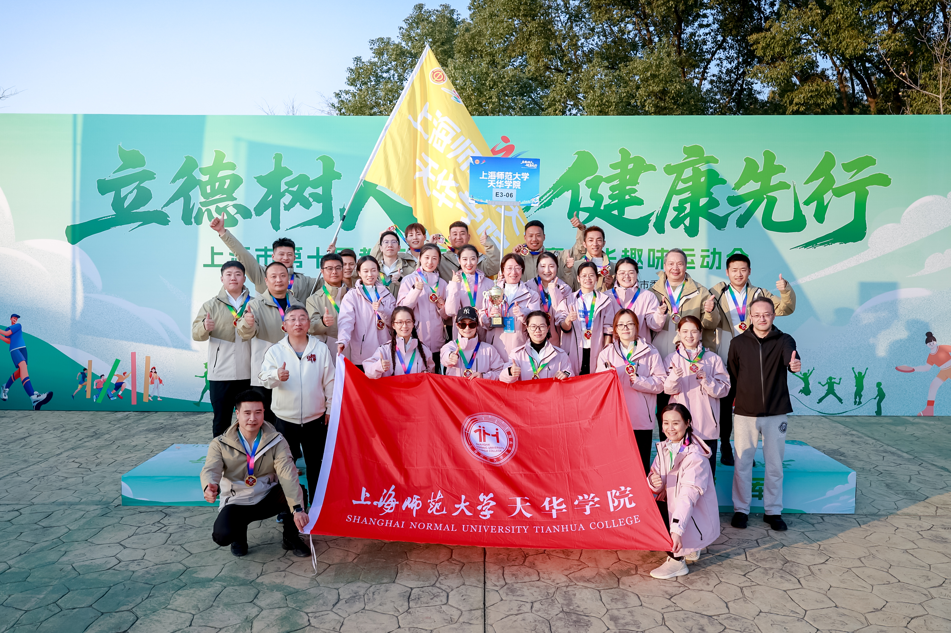上海市第十届教工运动会开幕 上海师范大学天华学院勇夺趣味运动会B组总分第一11月22日,由中共上海市教育卫生工作委员会、上海市教育委员会、中国教育工会上海市委员会联合主办的上海市第十届教工运动会启动仪式在东方绿舟隆重举行。来自全市各校、区教育局及直属单位的80余支代表队、近3000名教职工齐聚一堂,共同拉开本届运动会的帷幕。本届运动会以“立德树人、健康先行”为主题,旨在倡导将健康理念融入教育实践,全面展现上海教工队伍健康奋进、团结超越的精神风貌。在盛大的开幕式后,各项赛事相继展开。上午,由上海师范大学天华学院10位教职工组成的代表团队完成了5公里健步走,展现了天华团队奋勇拼搏,昂扬的精神面貌。下午的趣味赛事更是如火如荼。天华学院的教师们在不同项目中连传捷报。在首战项目“使命必达”中,黄鹏飞、王振、韩正、董秋福、周丽婕、张旭、蔡筱烨、姜玉环8位老师默契协作,荣获B组第三名。随后的“薪火相传”项目中,万伟平、王振、徐风帆、韩正、蔡筱烨、姜婷婷、赵擎、辛亚凤8位老师稳定发挥斩获B组第二名。在“合力跳长绳”项目中,万伟平、徐风帆、高志平、孙圣东、戴剑辉、姜玉环、殷美琳、辛亚凤、宋佳、张旭10名老师凭借平时刻苦训练打下的坚实基础,以三分钟307跳的优异成绩遥遥领先,勇2025-11-24