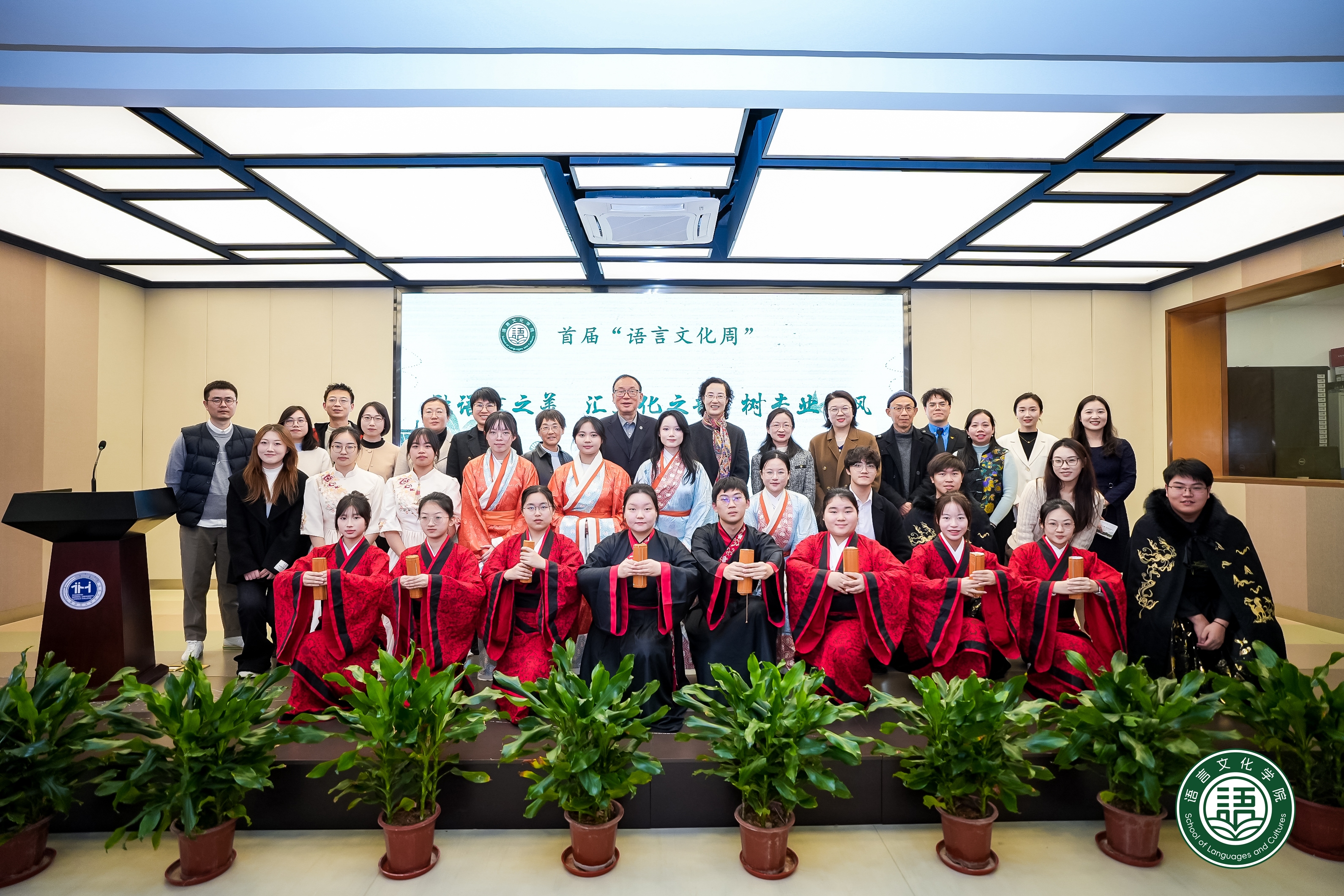 文韵启幕 集趣开市|语言文化学院首届“语言文化周”活动正式启动!为深耕语言文化育人内涵、打造学院特色品牌,在天华学院建校二十周年之际,语言文化学院成功举办首届“语言文化周”活动。本次活动以 “融语言之美,汇文化之韵,树专业之风”为主题,整合启动仪式、语言文化集市、莎剧之夜专场表演等多元形式,搭建语言交流、文化传播与艺术展示的综合平台,既是学院深耕专业建设、丰富校园文化生活的重要举措,也是以文化人、以语育人,推动中外文化交融、传承中华优秀语言文化的生动实践,为全校师生呈现了一场兼具思想性、观赏性与参与感的语言文化盛宴,助力校园文化建设与学院品牌影响力提升。文韵启幕:启语韵华章,赴文化盛宴12月10日上午10:30,语言文化学院“融语言之美,汇文化之韵,树专业之风”语言文化周启动仪式在图书馆四楼报告厅隆重举行。校党委书记高建华、语言文化学院院长胡玥、副院长孙超、总支书记郭阿诺、院长助理张文庭、童佳蕙,指导教授卜友红、姚胜旬、罗季美、英语专业主任邹冰洁、日语专业主任张丽珺、汉语言文学专业主任王春晓以及各专业师生代表齐聚一堂,共同见证了这场语言与文化的盛宴启航。启动仪式在汉语言文学专业学生带来的雅乐表演《上春山》中拉开帷幕,清音古韵,宛然春风拂面,为活2025-12-10 -